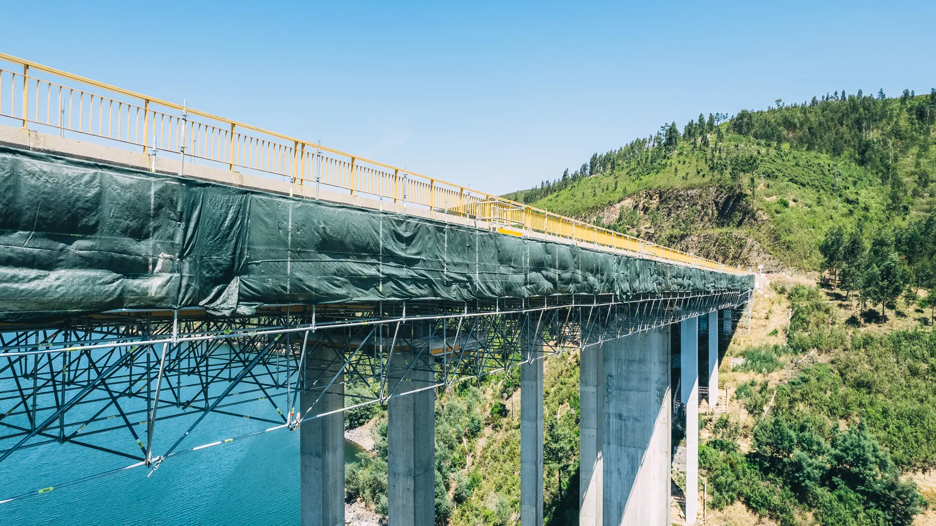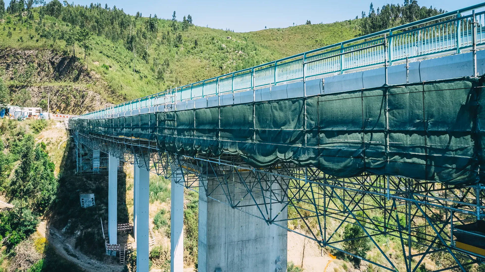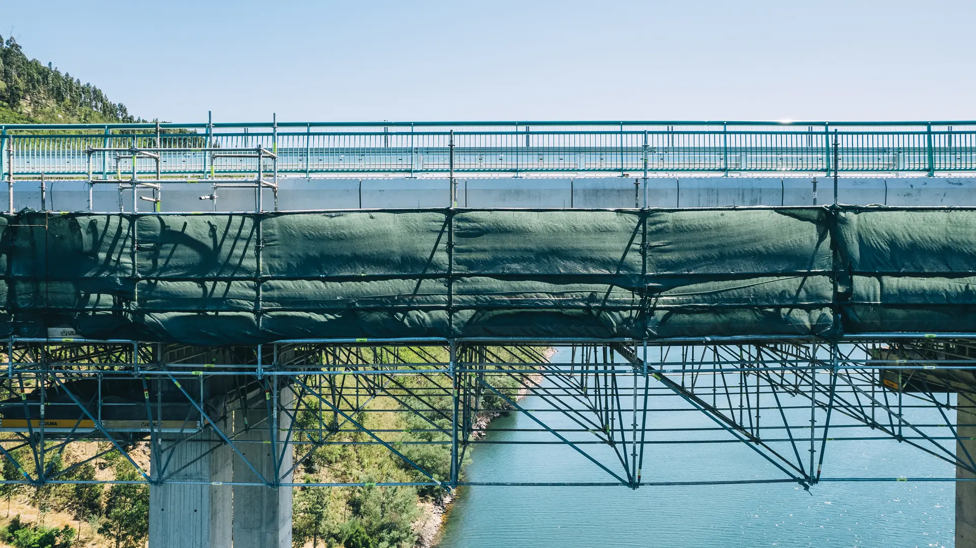 As soluções implementadas foram fundamentais para a execução de trabalhos em altura, incluindo operações de limpeza, reparação estrutural, tratamento de superfícies e pintura. Durante toda a empreitada, assegurámos condições de máxima segurança, estabilidade e eficiência, permitindo a manutenção rigorosa desta importante via de comunicação.