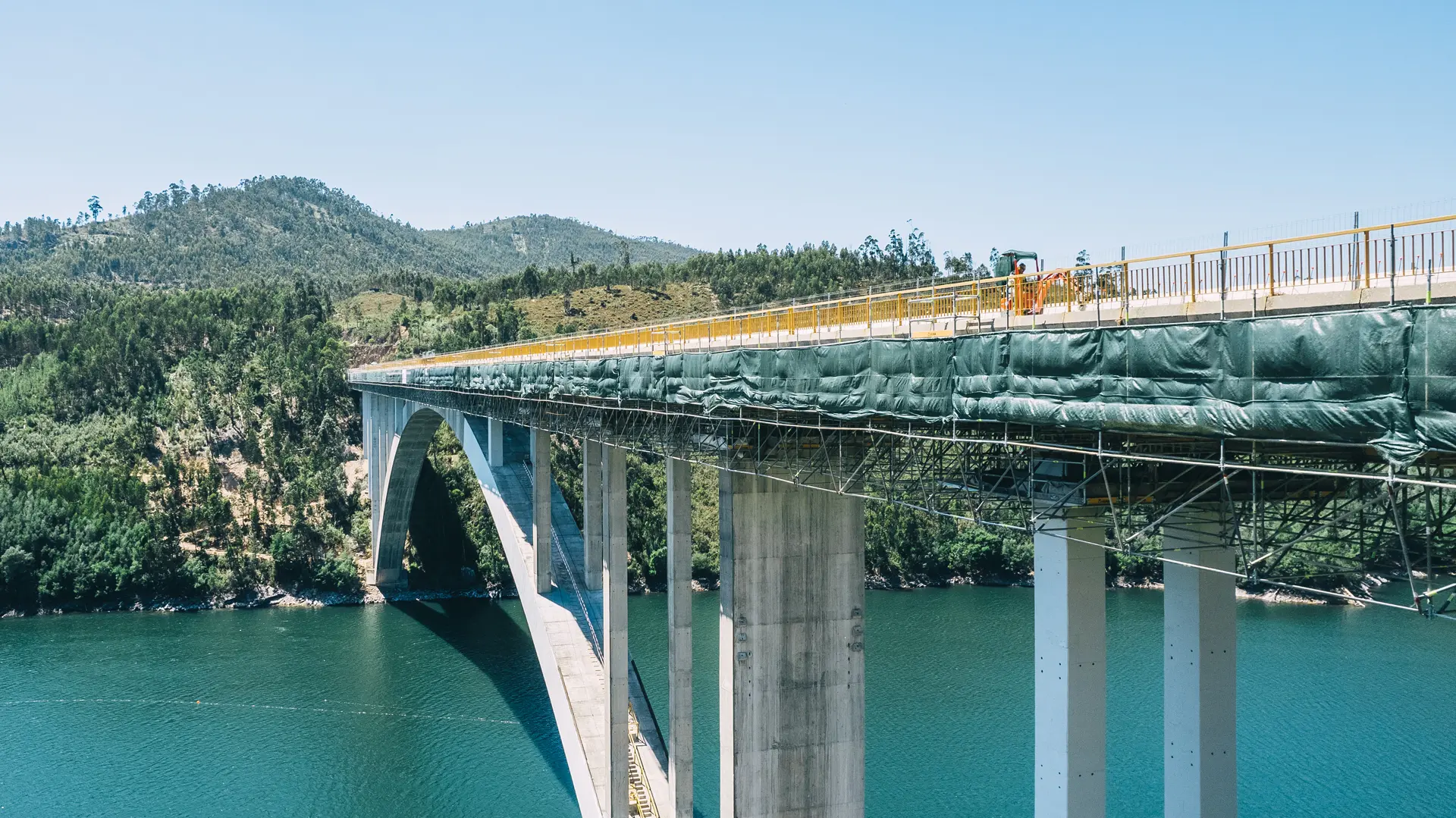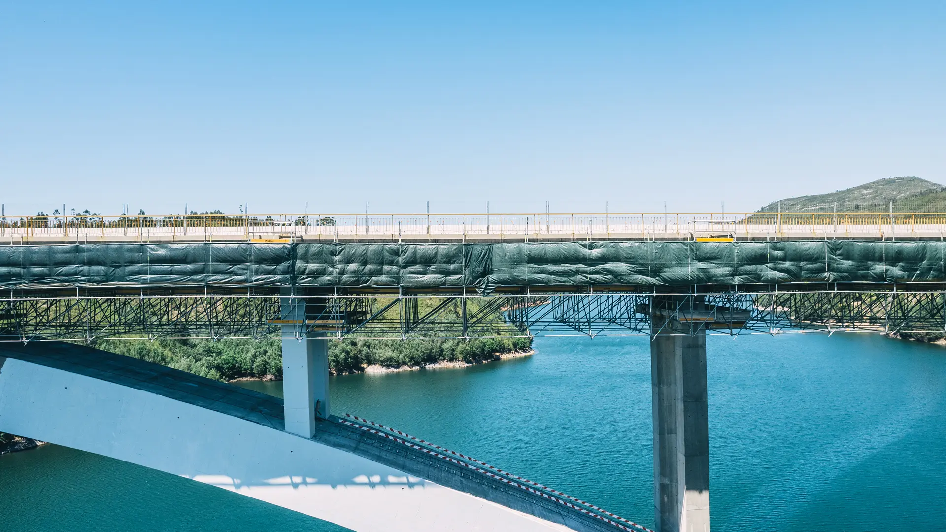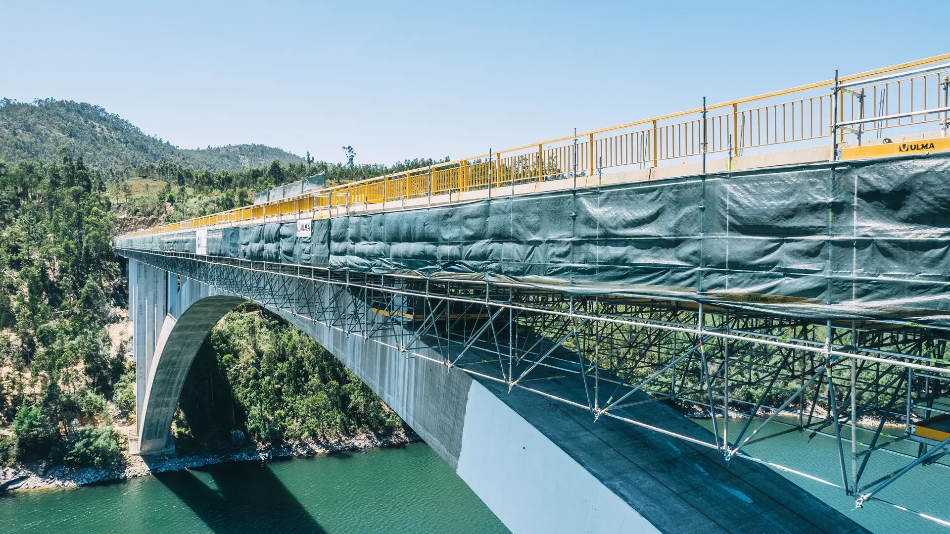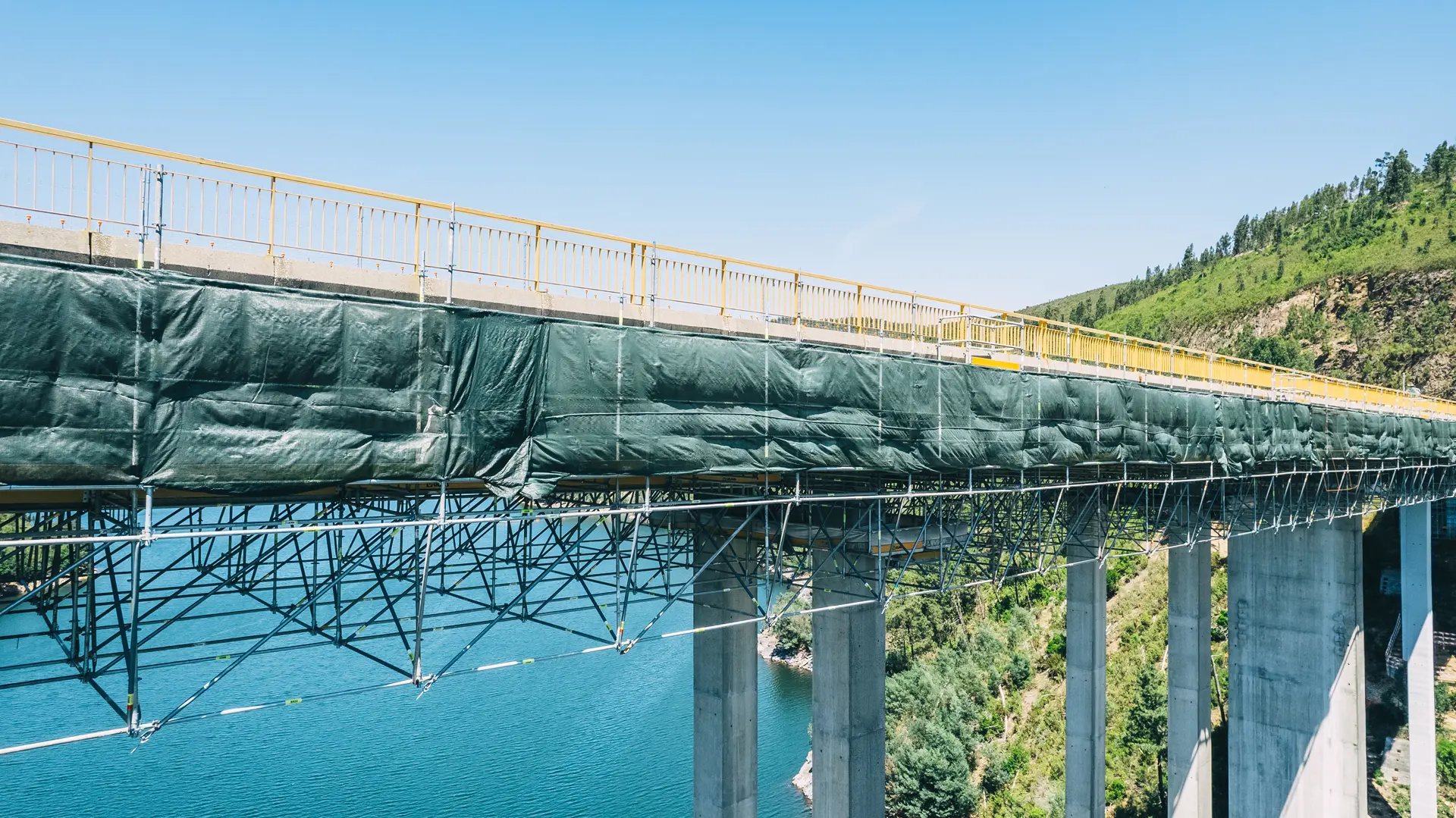 As soluções implementadas foram fundamentais para a execução de trabalhos em altura, incluindo operações de limpeza, reparação estrutural, tratamento de superfícies e pintura. Durante toda a empreitada, assegurámos condições de máxima segurança, estabilidade e eficiência, permitindo a manutenção rigorosa desta importante via de comunicação.