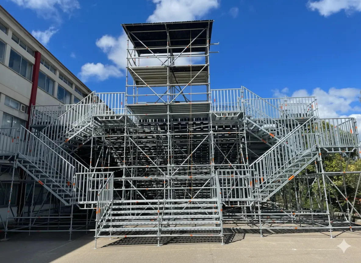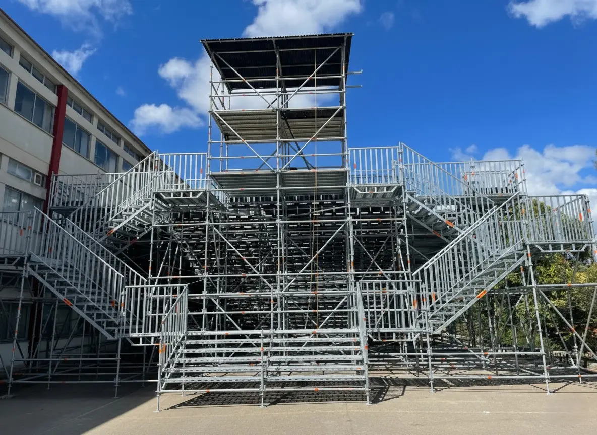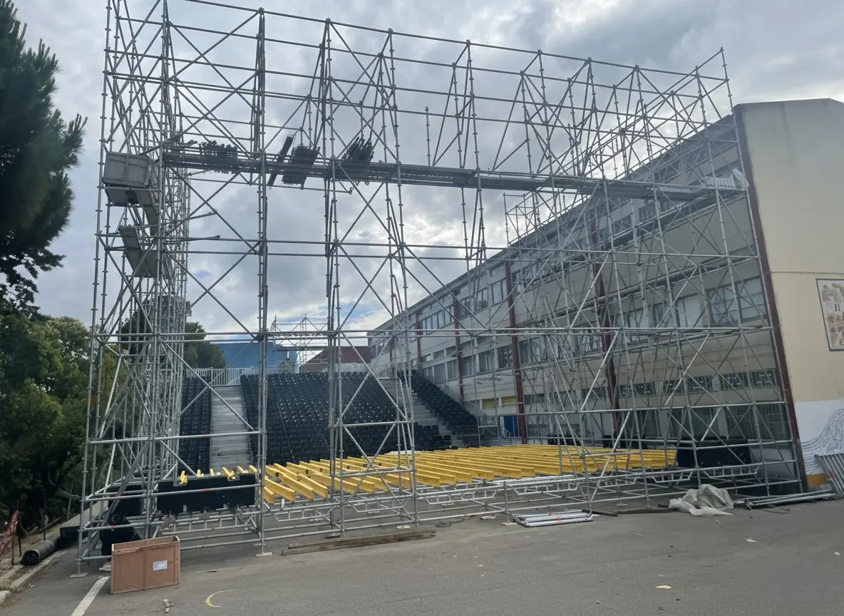 Implementamos estruturas de elevada complexidade técnica, desde as torres de iluminação e palcos de grandes dimensões até às bancadas para o público. Cada nó de ligação nestas estruturas multidirecionais é planeado para garantir estabilidade absoluta, suportando cargas dinâmicas elevadas.