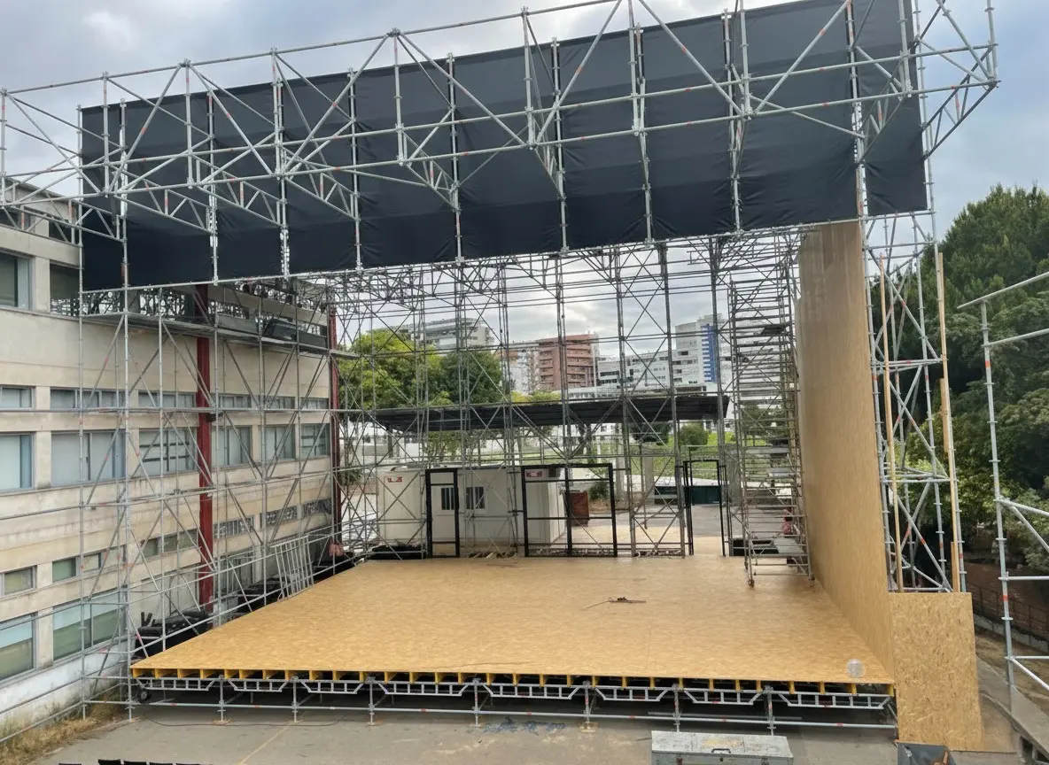 A intervenção da Género Inédito destaca-se pela capacidade de transformar espaços abertos em recintos de espetáculo funcionais, adaptando sistemas de andaime versáteis às irregularidades do terreno. Do nivelamento rigoroso das bases à instalação de guardas de segurança, garantimos que todas as infraestruturas temporárias possuem o rigor e a robustez de construções permanentes, cumprindo as normas mais estritas de segurança em eventos.